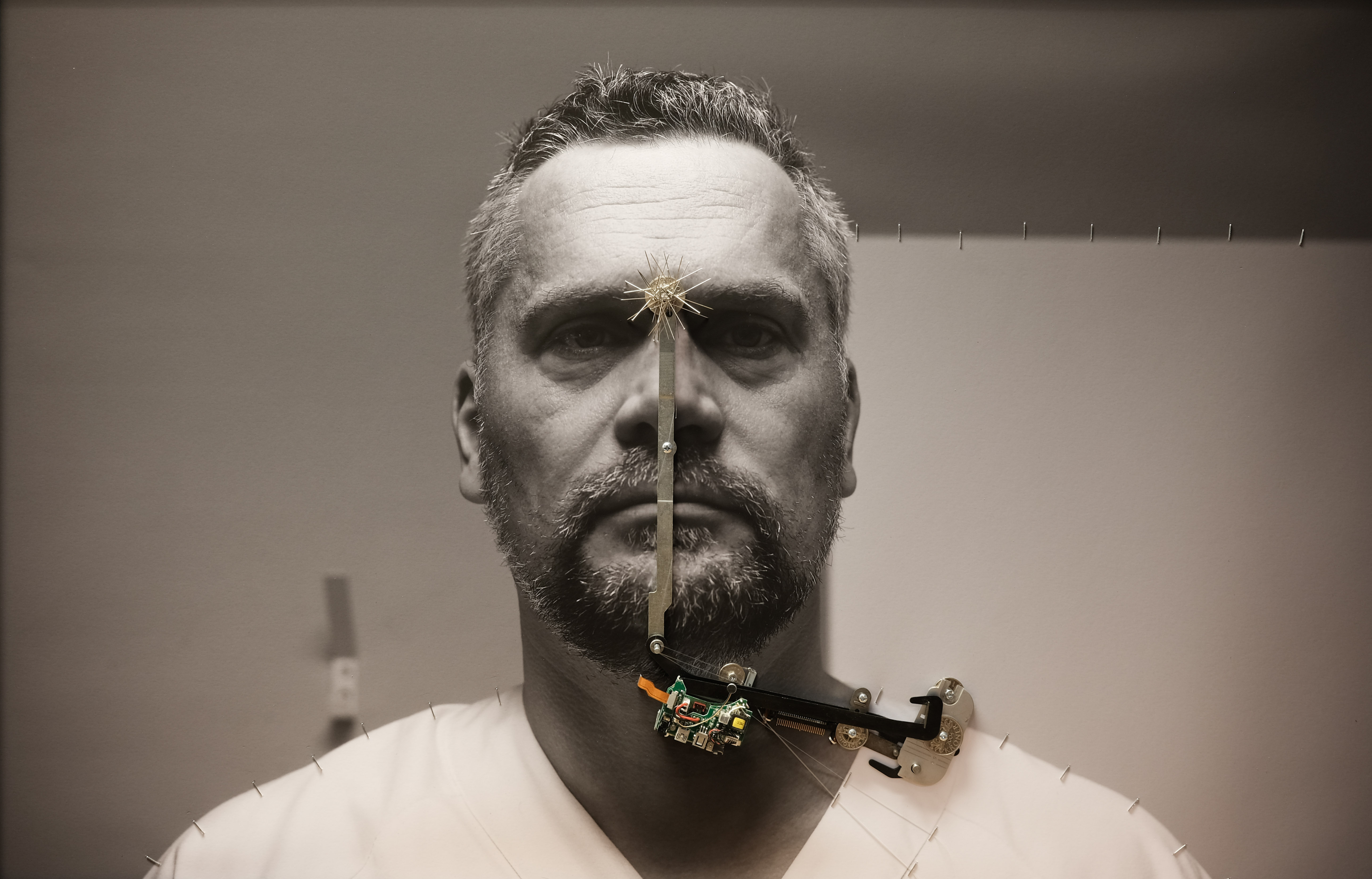 HEROINE photo, wood, parts of three sewingmachines and two pocket watches and some costumebuilt parts photo, design and assembly: norway 2020 framed with art glass, 60x85 cm
